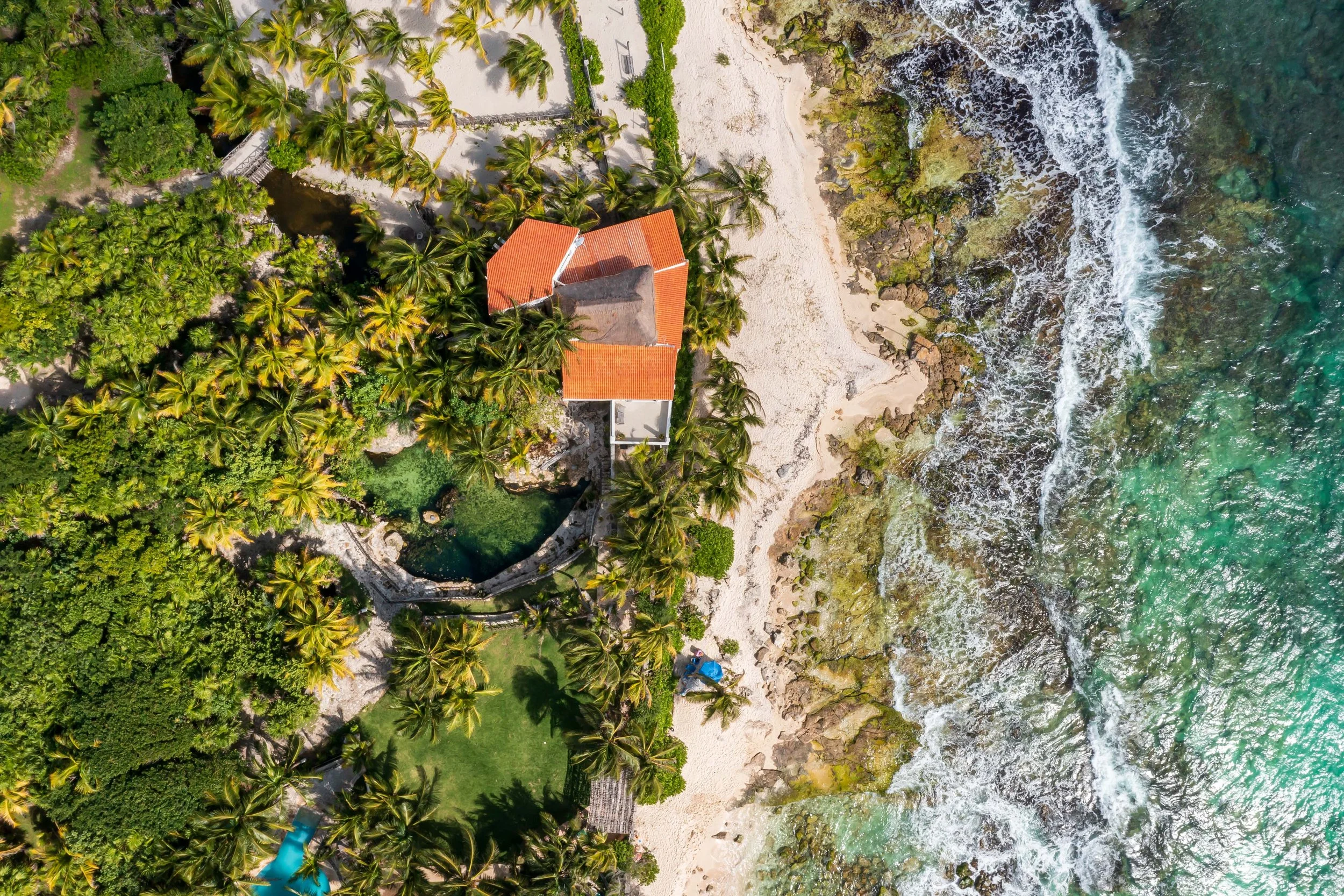 With an extra large natural cenote, expansive coconut garden, and the smell of the ocean air sweeping in, it is a genuine private beachfront oasis.